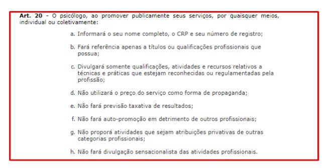 Há, naturalmente, algumas particularidades próprias da categoria (psicólogos). Isso não significa que psicólogos não possam fazer marketing, mas sim que é importante observar alguns aspectos elencados pelo Código de Ética da Psicologia.